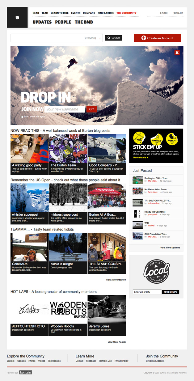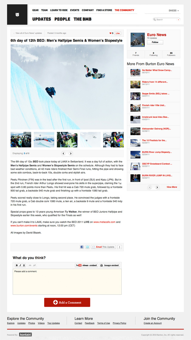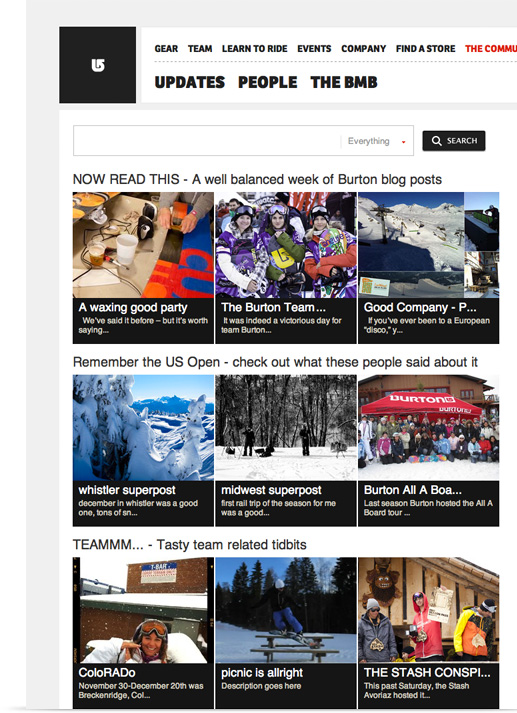 Burton needed a focused web community where their dealers, riders, fans could share media & blog about life on the slopes. The community also had to integrate seamlessly with Burton.com.