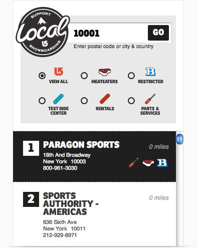 Local dealers can easily connect with local riders and users can easily find a Burton dealer in their area with the customized dealer widget seamlessly integrated into the right sidebar.
