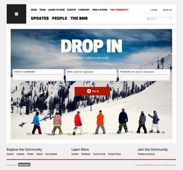 Burton’s branded signup page integrates with the existing look and feel of Burton.com.