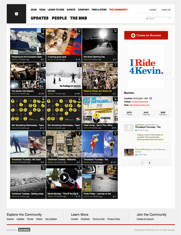 The Burton Community starts with their homepage - a digital magazine for everything Burton. It includes themed sections such as “Throw back Thursday”.